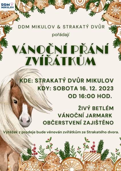 Můžete se těšit na živý betlém a vánoční jarmark výrobků dětí z kroužků DDM. Výtěžek z prodeje bude věnován zvířátkům ze Strakatého dvora. Uvítáme lahůdky pro zvířátka v podobě suchého pečiva, mrkve apod.